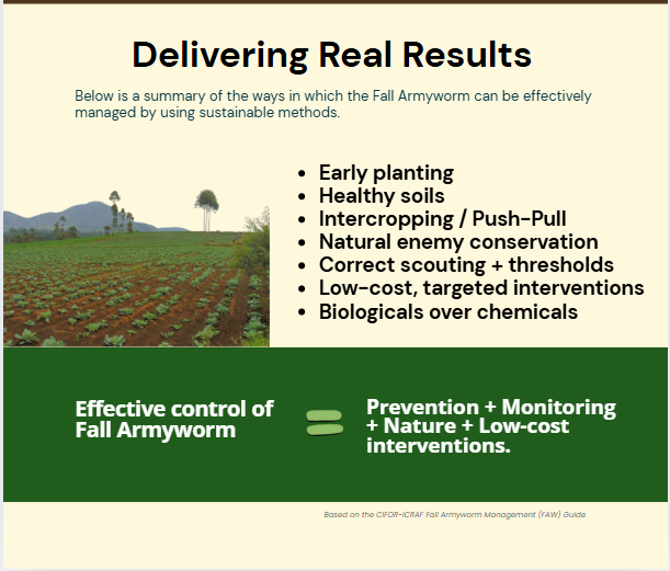 Integrated Pest Management (IPM) encompasses sustainable ways of dealing with the Fall Armyworm- a common pest in Africa.