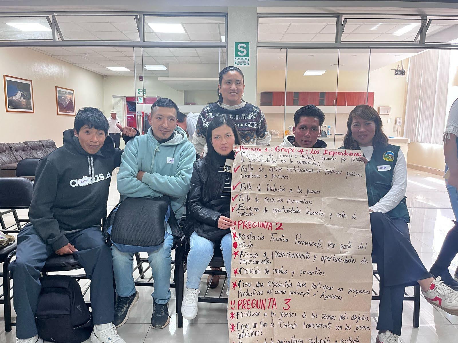 The reflections continued in working groups formed by the young participants, who responded to three central questions: the obstacles they face in their communities, the support or investments that would change their economic possibilities, and how a state fund for rural youth should work. The Waykis group identified limitations such as lack of financing, training, technical support, access to markets, and technological adaptation, as well as migration and loss of cultural identity. They raised the need for logistical and financial support, greater dissemination of state programs, and the implementation of a monitoring and community support system for a possible youth fund.