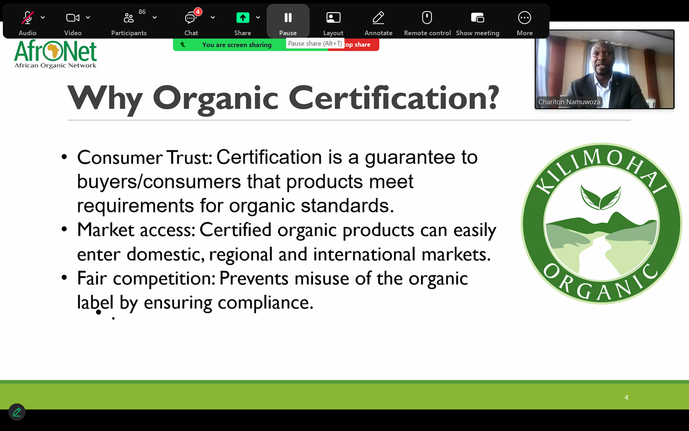 Chariton Namuwoza (See screenshot below during his presentation) delivered a presentation on organic certification systems, highlighting the importance of certification in building consumer trust, improving market access, and ensuring credibility in organic production. He began by providing an overview of NOGAMU and its role in promoting organic agriculture and supporting certification processes within the region.