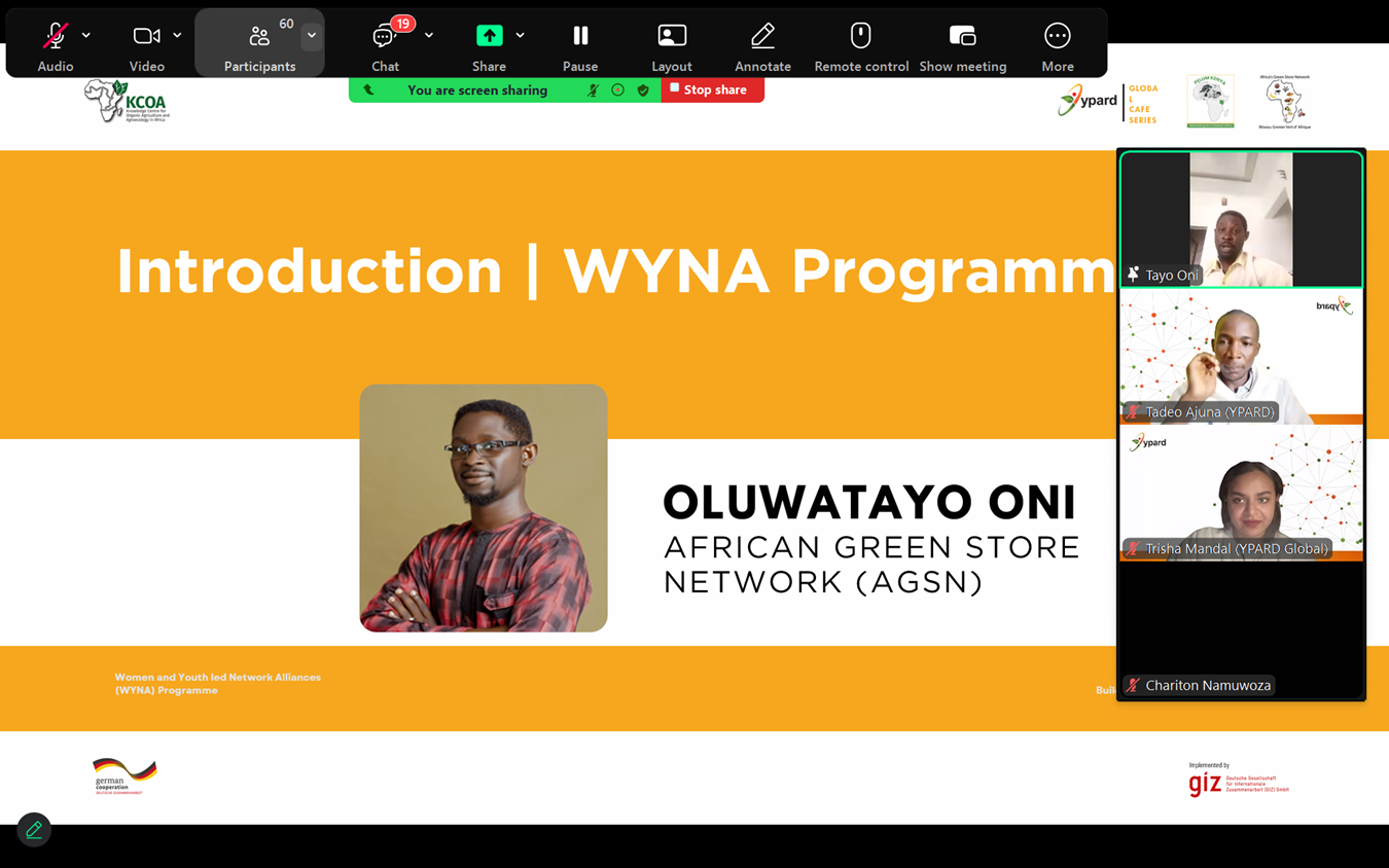 The Building Women & Youth-led Network Alliances for Agroecology and Organic Agriculture (WYNA) Programme builds on the experience and knowledge developed through the Knowledge Centre for Organic Agriculture and Agroecology in Africa (KCOA) project. Implemented by GIZ in collaboration with YPARD, PELUM Kenya, and AGSN, it promotes collaboration, capacity building, and leadership development. WYNA raises awareness, equips youth and female professionals with practical skills, and fosters entrepreneurship, green jobs, and strong network partnerships. Through inclusion and innovation, the programme empowers the next generation of African agrifood leaders by supporting fellows, interns, and community-driven solutions. In order to provide a platform for dialogue, peer learning, and networking among diverse stakeholders across regions for youth and women, the WYNA programme is organizing a series of WYNA Global cafes among which is the very first WYNA Global Cafe held online on 19th February 2026 under the theme Organic Certification Systems.